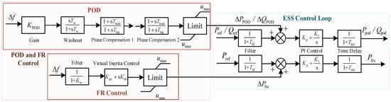 The controller uses the flexible response characteristics of the ESS to smooth out the WF output active power and compensate for its reactive power on a long-term scale under the premise that the configured ESS capacity is reasonable and to improve the system frequency stability. The FR control adds a PI controller to the power control loop of the energy storage system to eliminate system frequency deviations; the POD control is a phase compensation link that can be added to the active power control loop of the ESS or the voltage control loop.