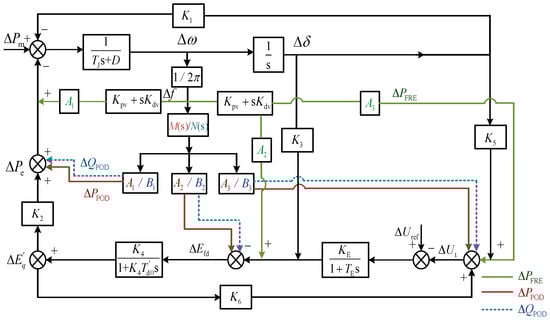 In Equation (11), G1 (s), G2 (s), and GE (s) are the coupling channels of the system synchronous generator, while the green and red (blue for reactive power) lines in Figure 7 are the additional coupling channels.