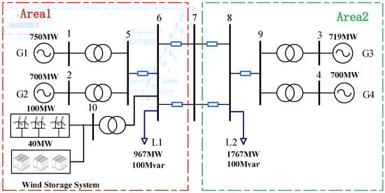 To validate the influence of the additional active control link coefficients of the wind turbine on the low-frequency oscillation characteristics, we built a four-generator and two-area system based on the PowerFactory-DIgSILENT 2019 SP4 simulation software, as shown in Figure 8, with the WF connected at bus 6. The simulation parameters are shown in Appendix C [].
