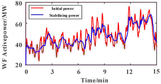 To balance the power system’s stability and economic efficiency, the power fluctuation threshold for the wind farm is defined across two temporal scales: the output power variance of the wind storage system should not surpass 10% of the wind farm’s rated capacity on a minute-by-minute basis, and it should not exceed 30% of the rated capacity over thirty-minute intervals []. Implementing these limitations significantly enhances the power system’s stability.