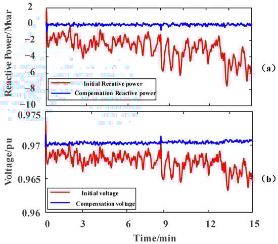 Comparison of (a) wind farm output reactive power curve and (b) output voltage curve.