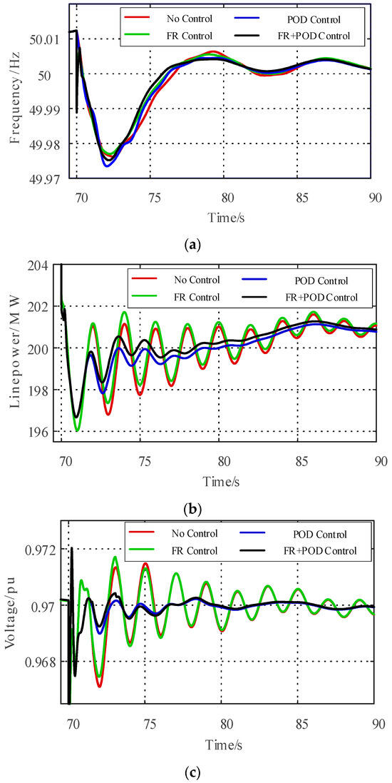 The system’s responses to the load increase of 30 MW. (a) System frequency. (b) Line active power. (c) WF voltage.