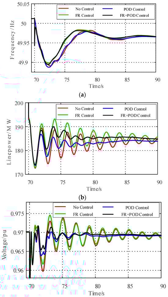 The low-pass filter in the FR controller is used to mitigate the sudden changes in frequency. Meanwhile, the PI controller use to reduce the frequency error, and the design objective is to reduce the frequency error within the recommended deadband of the governor, so that unnecessary governor action can be avoided. Under these conditions, the control coefficients can be selected, with the trial and error method, to consider the frequency regulation effect and achieve the most obvious damping effect. The design parameters for the POD and FR controllers are shown in Appendix B.