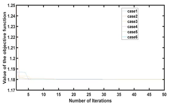 The performance of the PSO, in reaching the optimized value for a given case, under different parameter conditions is shown in Figure 3. Among the considered six cases, in first three cases (case 1 to case 3), only number of particles was changed (10, 30 and 50 respectively) while maximum iteration (150), wmax (0.9) and wmin (0.2) values were kept constant. For the last three considered cases, wmax values were changed (0.9, 0.7, and 1, respectively). Similarly, wmin values were changed (0.2, 0.1, and 0.4, respectively) while keeping number of particles (30) and number of iteration (150) constant. In all considered cases, the PSO obtained the optimized objective function value (1.1802) within 15 iterations, although in all cases the starting point was different as the initial positions and velocity vectors were randomly generated.