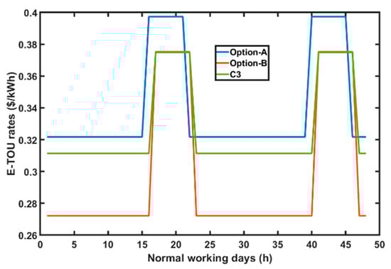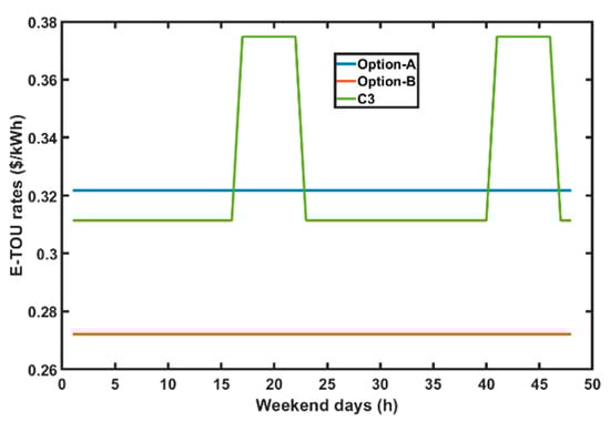 As previously discussed, PG&E has been considered for this work as a utility service provider. PG&E has three TOU electricity rates [43] as shown in Figure 4 and Figure 5 for normal working days and weekend respectively that the consumer can choose. Therefore, E-TOU option-B, has been considered for our work as it is the most economical among the offered electricity prices.