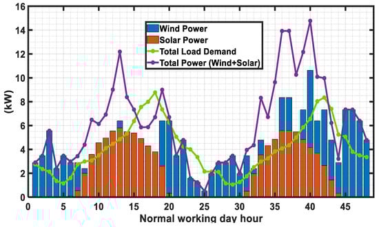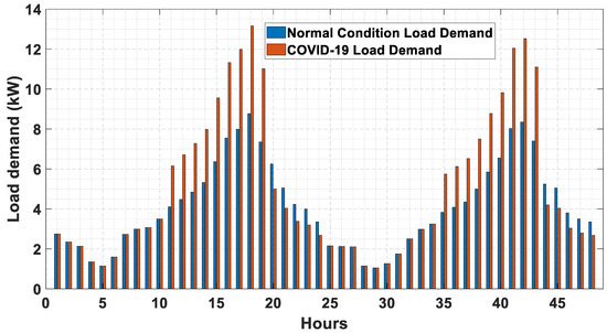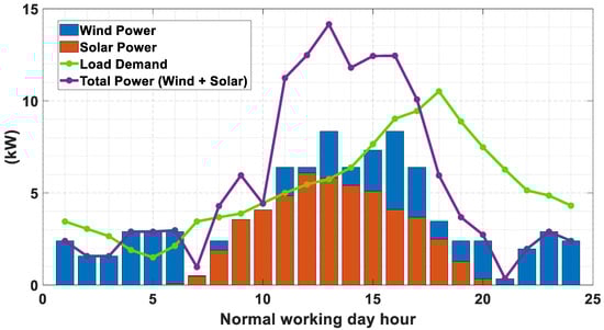 As for the COVID-19 pandemic situation, people are forced to stay at home. Therefore, load consumptions are assumed to be similar for both normal working days and weekends. The energy consumption will be higher for the working day under COVID-19 situation as compared to the normal working day as the people will stay at home during office hours [21,22], as shown in Figure 15. The solar energy and wind energy are considered to be the same as shown in Figure 6.