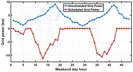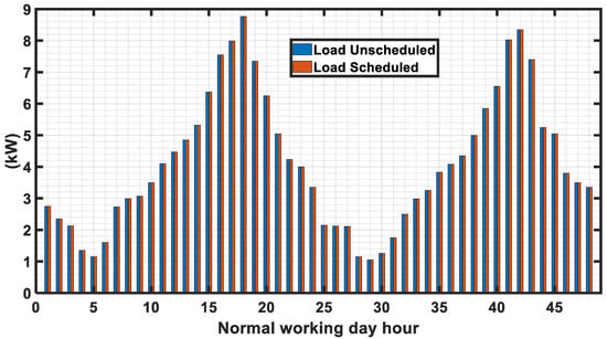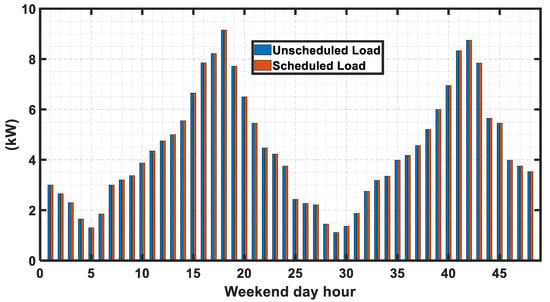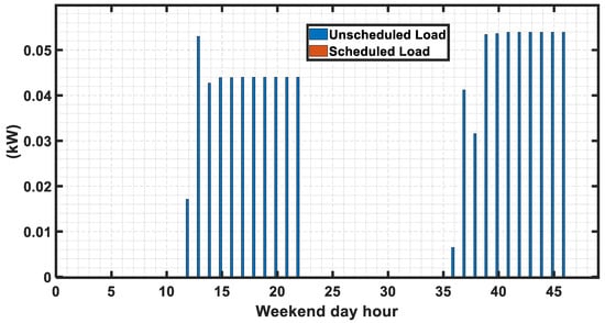 The renewable energy along with the load demand for the considered weekend days is shown in Figure 11, which are different than the considered cases as shown in Figure 6. Like normal working days, both unscheduled and scheduled cases are considered for weekend days. The unscheduled load and the load consumption for the scheduled case are shown in Figure 12 followed by the scheduled loads shown in Figure 13. From Figure 13, it is evident that the required load to be scheduled for later hours is higher in unscheduled conditions than that in scheduled cases where the load to be scheduled for later hour is zero for all hours as the difference of power is supplied by the grid. But in case of scheduling, the load is determined each hour by the objective functions.