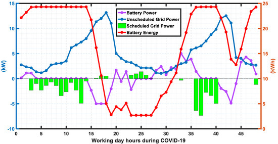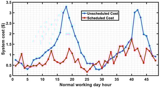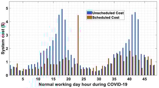 Figure 17 represents the system cost during COVID-19 situation, which indicates that the system cost is much less as compared to the unscheduled cases; as for unscheduled cases, the extra load demand is fulfilled by the grid power. Moreover, most of the time for scheduled cases the energy cost is close to the desired cost of $1 during off-peak hours and $1.75 during peak hours.