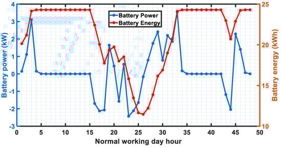 The charging and discharging operation for battery energy storage in case of load scheduling is shown in Figure 10. The positive battery power indicates the charging of the battery when the generated power is less than the demand, which will increase the battery stored energy.
