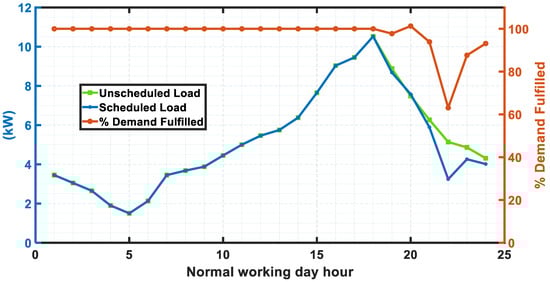 As for the scheduling, the renewable sources and battery storage are used for scheduling loads using the objective function proposed in Equation (3). Figure 16 shows the scheduled loads and percentage of demand fulfilment by the proposed scheduling method where more than 75% demand is fulfilled at all times. The load is kept for the next hours to have minimum objective function as proposed in Equation (3).