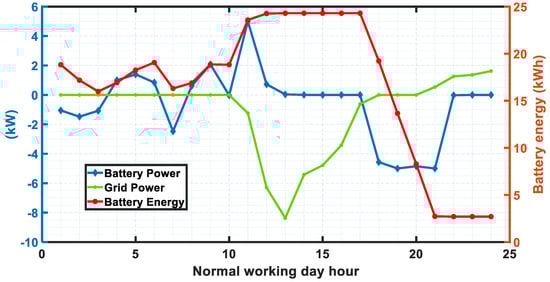As per grid demands, at least 2 kW power was provided during the 14th to 18th hours as shown in Figure 23 and therefore, the incentive was achieved although load was scheduled for the later hours. The battery discharges from the 14th to 18th hours to provide load power and to provide the extra power required for the load and grid demand.