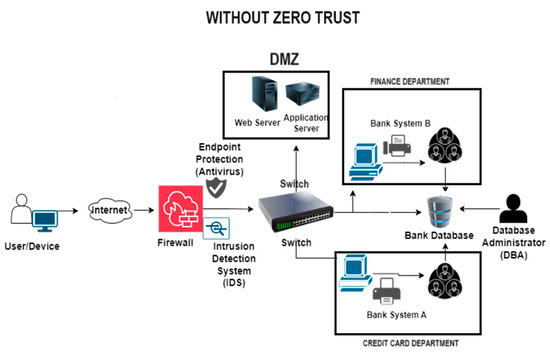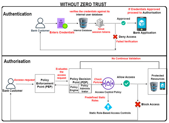 The Zero Trust model treats every request as if it came from the public Internet rather than trusting that anything behind the company firewall is secure. Zero Trust teaches us to “never trust, always verify,” regardless of the source or target of a request [21]. Each request is checked for authentication, authorisation, and encryption before access is given, as shown in Figure 2. The principles of micro-segmentation and least-privileged access are used to restrict communication between nodes. Anomalies are identified and dealt with instantly by employing sophisticated intelligence and analytics.