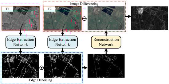 The flowchart of change detection using the EO-GAN is illustrated in Figure 1. With the multitemporal images and , which are acquired in times and , respectively, an edge extraction network is used to extract the edge of the two images. A denoised edge map of via the two edge maps is then derived. Then the reconstruction network is used to reconstruct the image with the representation style of from the denoised edge map of . Finally, the reconstructed image and are compared to generate the difference image.