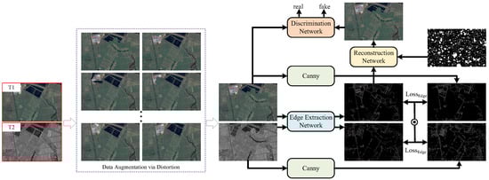 To accurately detect the changes, it is crucial to train the two networks, i.e., the edge extraction network and the reconstruction network. Therefore, we design an adversarial training method based on the cGAN, as shown in Figure 2. To sufficiently train the networks with only the two images, we first construct a training set by data augmentation. As shown in Figure 2, we distort the two images with random patches extracted via superpixel segmentation and image twisting. Then following the cGAN with the edge map as the latent representation, the objective in Equation (2) is first constructed. To extract the edge information in latent representations, the Canny operator is used to extract the edges as the reference labels of the edge extraction network. Next, we detail the edge extraction, image reconstruction, and edge denoising operator.