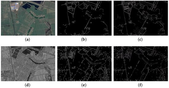 Illustration of the learned edge extraction network: (a) optical image, (b) edges of the optical image generated by the Canny operator, (c) edges of the optical image generated by the edge extraction network, (d) SAR image, (e) edges of the SAR image generated by the Canny operator, and (f) edges of the SAR image generated by the edge extraction network.