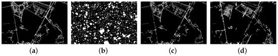 where denotes the neighborhood of the pixel position of . It can be easily implemented by using a convolution kernel with the size of the neighborhood. If it is set to , the points that get restored in each iteration must be adjacent to the edges that already exist in . If it is larger than , some points that are not connected to the edges in may also be recovered. Most of the edges in are common overlapping edges in the unchanged region, and the rest belong to the changed region, where the edges in and can only overlap a small fraction. By using this iterative algorithm, the incomplete edge of the changed region can be restored to its complete state in . In the meantime, in the operation of taking the intersection filtering out most of the isolated noise, and unless the noise point is connected to an existing edge in , they will not be recovered. In the same way, we can also obtain , which is the final input of the reconstruction network during change detection. The complementary edges with different sizes of kernels are shown in Figure 5.