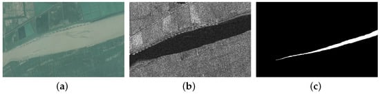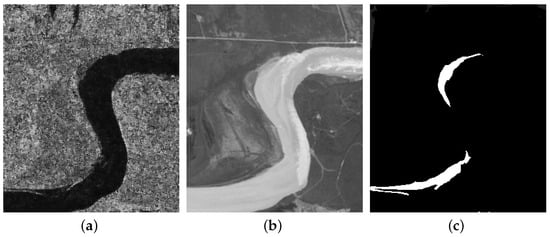 YR_1 dataset that shows the change of part of the Yellow River in China: (a) optical image, (b) SAR image, and (c) reference image.