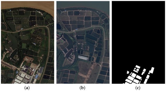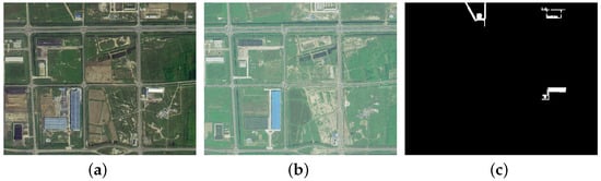 Dongying dataset that covers an area in the Tangtou Village of Dongying City in China: (a) image acquired in May 2021, (b) image acquired in September 2017, and (c) reference image.