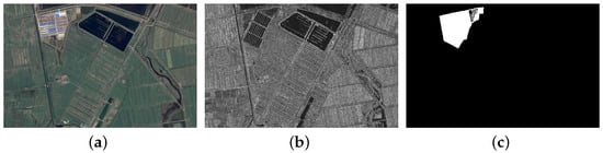 Shuguang dataset that was taken at the Shuguang Village in Dongying City of China: (a) optical image, (b) radar image, and (c) reference image.