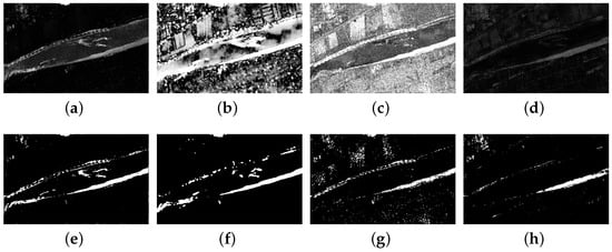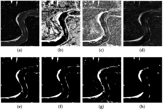 Difference images and change detection results of the compared methods on the Yellow River dataset: (a) difference image of SCCN, (b) difference image of cGAN, (c) difference image of HTP, (d) difference image of the proposed method, (e) result of SCCN, (f) result of cGAN, (g) result of HTP, and (h) result of the proposed method.