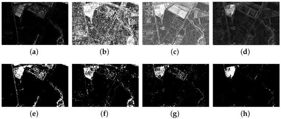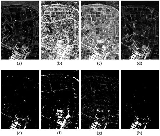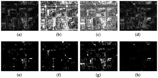 Difference images and change detection results of the compared methods on the Guangzhou dataset: (a) difference image of SCCN, (b) difference image of cGAN, (c) difference image of HTP, (d) difference image of the proposed method, (e) result of SCCN, (f) result of cGAN, (g) result of HTP, and (h) result of the proposed method.