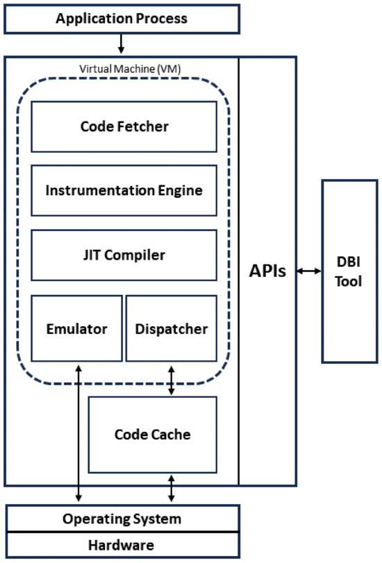 D’Elia et al. [8] suggest that a DBI system can be generally regarded as an application virtual machine that provides monitoring and modification capabilities for instructions and data in user-written components of an analysis tool. In order to establish an environment that allows for the observation and potential modification of the entire architecture state of the target program, a separate execution environment is typically required, and DBI engines in such environments mainly have a common structure.