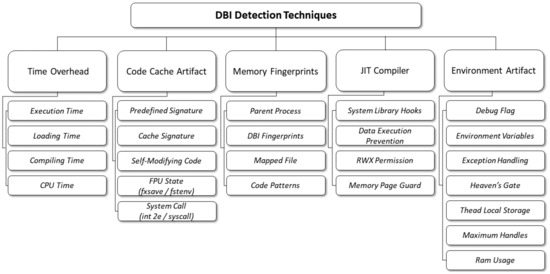 Works under the academic approach do not specifically identify the targeted DBI but reveal differences in categorizing techniques. Refs. [7,21] encompass common classifications such as code cache, JIT overhead, and environment artifacts. Additionally, Ref. [7] includes detection categories for changes caused by JIT compilers and countermeasures for some techniques. Ref. [20] provides the most detailed categorization of detection techniques, including countermeasures similar to those in [7].