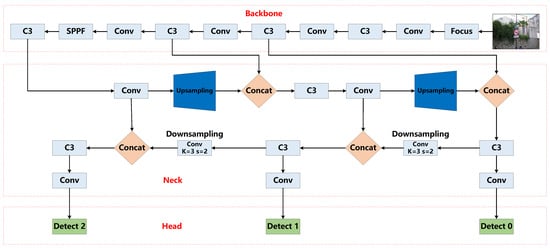 Four primary components make up the YOLOv5(s) algorithm: input, backbone network (Backbone), neck, and head. The Focus, Conv, CSP, and SPPF networks make up the majority of the backbone network. The Focus structure separates the input image into 16 identically sized blocks, then joins the blocks to create four identical images for additional processing. The CSP network divides the input into two sections, stacking the remaining blocks in the first and performing extra operations in the second. The 5 × 5 MaxPool layers are successively applied to the input by the SPPF structure, which then sums the computed values from each layer. The output is then generated using a Conv+BN+Relu structure. Figure 1 shows how YOLOv5(s) is structured.