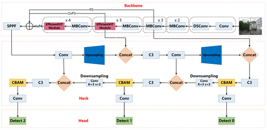 The L4 EfficientViT module structure processes the P3 special layer after it has been input into an MBConv module, resulting in the derivation of the P4 feature layer. The P4 broad dimension is extended using a multiplication factor of 4, whereas the P3 wide dimension is expanded using a factor of 2. The P2, P3, and P4 feature layers are additionally concatenated, and the resulting cumulative outputs are then fed into L5 MBConv modules for convolutional processing, producing the final output feature layer.