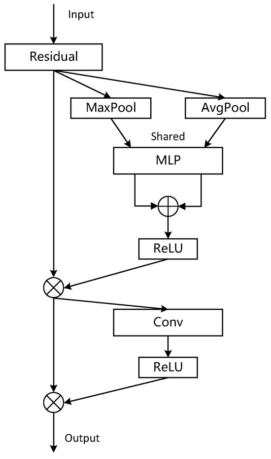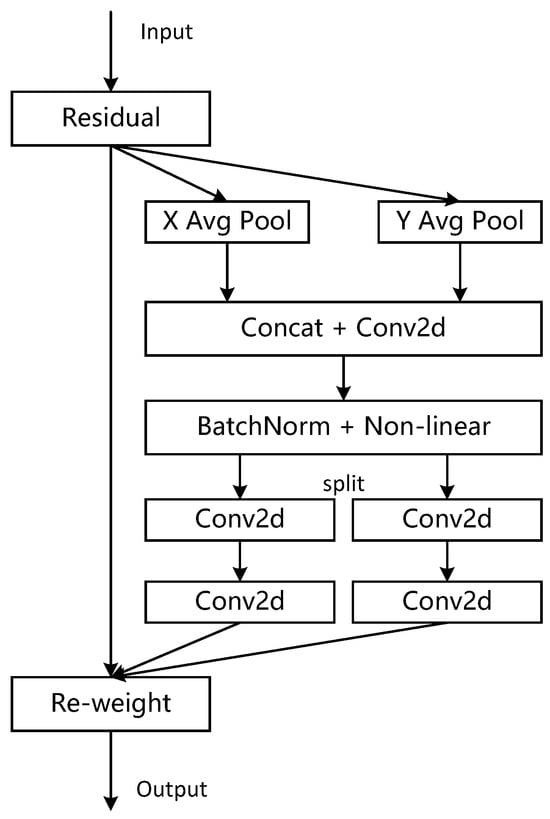 The feature map’s channels can be selectively enhanced or suppressed using the coordinate attention mechanism (CA). It makes it easier to extract richer and more important characteristics by learning channel weights [22]. In order to allow the model to prioritize important channel information during feature processing, CA primarily operates on the channel dimension of the feature map. For a visual illustration, see Figure 7.