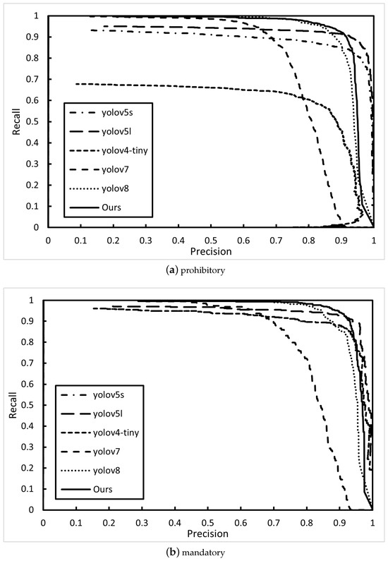 The P-R curve in Figure 9a indicates that the current approach outperforms two widely used object identification algorithms, YOLOv4-tiny, YOLOv7, and YOLOv8, in terms of detecting prohibitory category objects. This conclusion is supported by the rest of Figure 9. Furthermore, the P-R curves shown in Figure 9b,c unmistakably show that the current approach outperforms the YOLOv7 object detection algorithm in terms of recognizing mandatory class and warning items. Notably, the 3L-TT100K dataset consistently performs better than the other five object detection algorithms for all three classes of objects when the precision is 0.9.