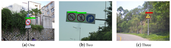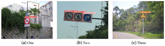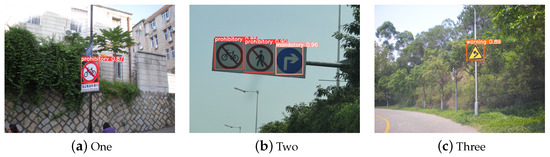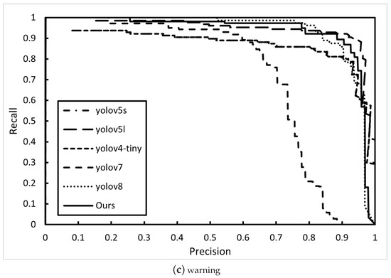 Figure 16 shows the detection effect of the YOLOv8 algorithm. From Figure 16a,b, it can be seen that the overall detection accuracy is worse than the model in this paper. The methods suggested in this paper provide higher detection performance compared to existing mainstream detection algorithms for the warning class signage, especially taking into account the limited training samples available, as shown in Figure 12c, Figure 13c, Figure 14c, Figure 15c, Figure 16c and Figure 17c.