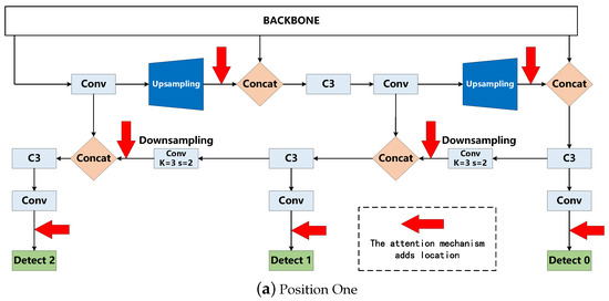 An attention mechanism is introduced to improve attention to the input and selectively focus on important information during feature extraction. As shown in Figure 10a–d, we chose the CA attention network and the CBAM attention network for this study and included them in the model. As shown in Table 5, when using EfficientViT as the backbone and positioning the Tim CBAM attention network at position Figure 10d, the algorithm achieves the best object detection results in terms of mAP and FPS. Notably, compared to adding the CA attention network at the same site, adding the CBAM attention network in Figure 10d results in a 1.8-point gain in object detection accuracy and a 9.75 images per second increase in detection speed. Additionally, utilizing YOLOv5-EfficientViT without the attention mechanism results in a 0.1% improvement in detection accuracy.