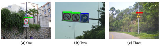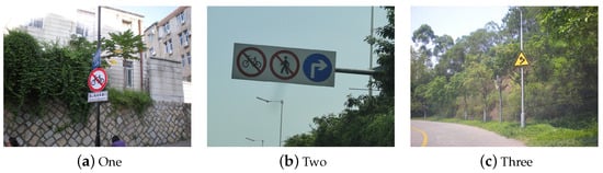 Six wide-angle DSLR cameras with large pixel counts were used to create the TT100K traffic signs dataset [29], and various lighting and weather conditions were present at each shooting location. The dataset’s final size is 2048 × 2048, with the original image’s resolution being 8192 × 2048. The panorama was then divided into four pieces. There are more thorough categories of traffic signs in the TT100K dataset, which has 221 distinct categories overall and 128 tagged categories. This study randomly chooses 9050 photos with traffic signs from the TT100K dataset and reclassifies the categories because the number of categories in the dataset is seriously unequal. This study uses the CCTSDB dataset categorization standard to divide the dataset into three categories: required directional signs, prohibitory signs, and warning signs. Table 1 lists the numbers for each category under the designation 3L-TT100K. The 3L-TT100K with dimensions 2048 × 2048 is used as a model to accelerate model training and verify the model’s capacity to detect the target. The size of the 3L-TT100K dataset is shrunk to 640 × 640 from 2048 × 2048.