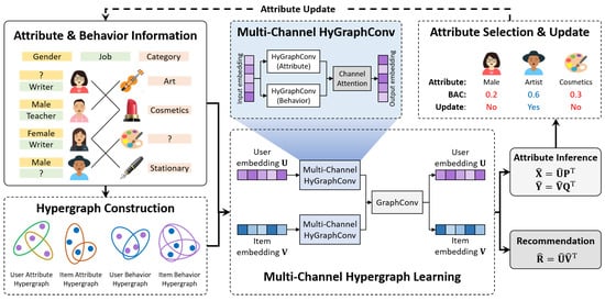 The pipeline of the proposed method. The initial attribute and behavior information, along with the constructed hypergraph structure, feed into the multi-channel hypergraph learning module. The learned embeddings are leveraged for attribute information and recommendation, where the former is further sent for attribute selection and update and the latter is the output of the proposed method.