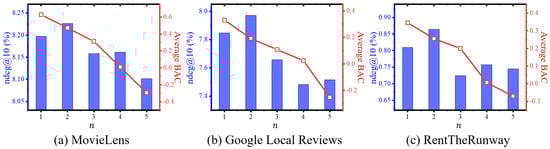 Experiments with BAC quintiles. Attributes are stratified based on their BAC into five distinct categories. These categories are ordered by BAC and are segmented into quintiles along the x-axis, denoted by “n”. For instance, n = 1 represents attributes in the top 20% of BACs, while n = 5 corresponds to the bottom 20%. The blue bars in Figure 2 represent the NDCG values for each quintile category. This visualization allows us to observe how the recommendation performance varies with the attributes of differing BACs. The red line across the quintiles depicts the average BAC within each category, providing a clear visual correlation between the BAC and the recommendation performance. The analysis reveals a discernible trend where higher BAC categories (), which represent attributes with stronger confidence, correlate with higher NDCG values. Conversely, as the BAC average decreases across the quintiles (), there is a noticeable decline in NDCG performance. This trend demonstrates the efficacy of the BAC as a reliable indicator of attribute quality and its consequent impact on recommendation performance. By employing attributes with higher BACs, our HCFA model effectively enhances the recommendation system, affirming the hypothesis that well-informed attribute selection based on confidence levels is crucial for optimizing collaborative filtering outcomes.