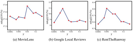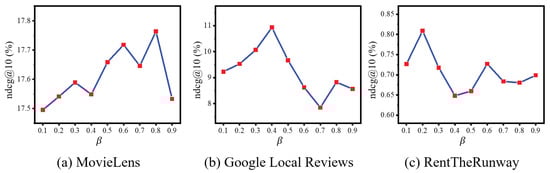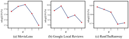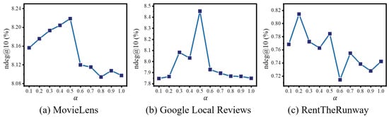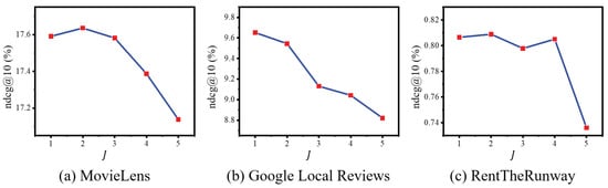 Datasets. We conduct experiments on three public benchmarks: MovieLens (https://grouplens.org/datasets/movielens/1m/ accessed on 30 October 2023) [], RentTheRunway (https://cseweb.ucsd.edu/~jmcauley/datasets.html##clothing_fit accessed on 30 October 2023) [], and Google Local Reviews (https://cseweb.ucsd.edu/~jmcauley/datasets.html##google_local accessed on 30 October 2023) [,]. These datasets contain behavior and attribute information, as shown in Table 2.