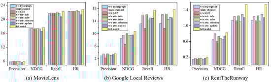 - Graph convolution ablation sets the graph convolution layer to evaluate the impact of the graph convolution layer. The full model outperforms this ablation by an average of 1.76%, 54.47%, and 37.29% on three datasets, respectively, illustrating that pairwise relationships in collaborative filtering are crucial for performance.