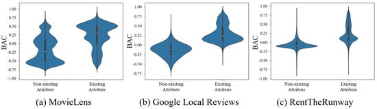 Violin plots depicting the distribution of BAC values for existing and non-existing attributes across three datasets.