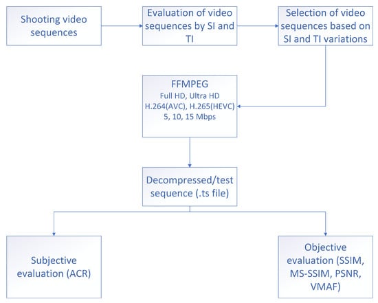 To begin with, we had to take numerous shots, from which we selected reference video sequences. These were chosen to cover as much space as possible in the SI and TI quadrants. Their description can be found in Section 6.1. The next step was to encode these reference sequences into a combination of full HD and ultra HD resolutions, using the H.264 (AVC) and H.265 (HEVC) compression standards and bit rates of 5, 10, and 15 Mbps using FFmpeg. FFmpeg is a collection of programs and libraries that enable the processing, editing, or playing of multimedia files. It is operated via the command line. In our case, the multimedia content had to be first encoded into a defined codec, which is a compression algorithm. Then, it was decoded to enable its use. With transcoding, it is possible to convert multimedia files to a different file container or codec, or to use different frame rates.