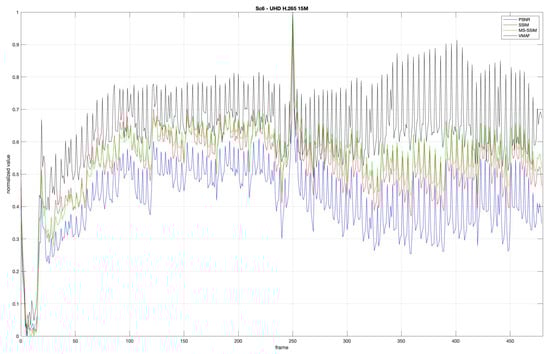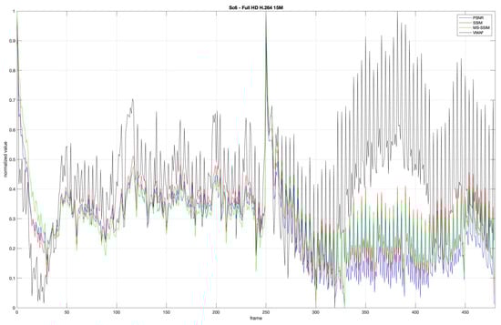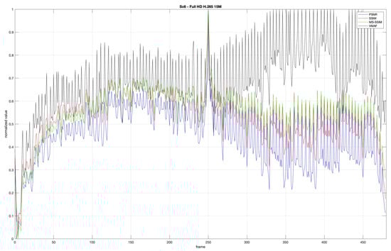 In the case of objective evaluation, we selected one video sequence to present the results, namely the traffic roundabout with a parking lot (Sc6). For this sequence, we present the evaluation progress frame by frame for the individual objective metrics (SSIM, MS-SSIM, PSNR, and VMAF) for a 15 Mbps bit rate in both resolutions and codecs. Results are presented by normalized value range <0, 1>. Here, it is possible to compare the overall correlation of the evaluated metrics.