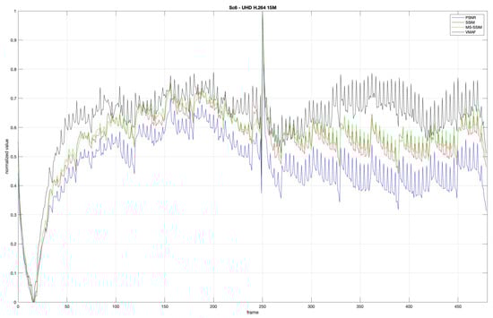 The results for the ultra HD resolution for the H.265 (HEVC) codec can be seen in Figure 3 and for the H.264 (AVC) codec in Figure 4. The full HD resolution can be viewed in Figure 5 for the H.265 (HEVC) compression standard and in Figure 6 for the H.264 (AVC) compression standard. With such a high bit rate, the H.265 compression standard achieves better results compared to H.264 for both resolutions.