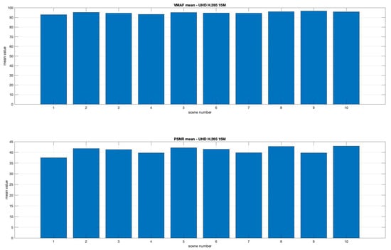 Mean values of VMAF and PSNR for UHD, H.264, 15 Mbps.