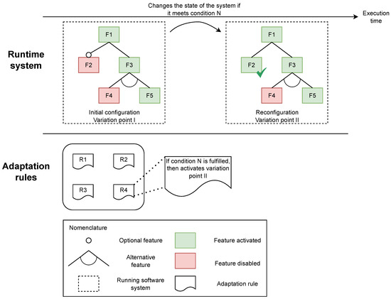 The software industry has grown enormously and has had to meet the high demands of customers and users regarding the benefits and quality of its products and services [1]. To respond to these new requirements, software engineering (SE) has been formulated as the discipline responsible for all aspects of software production through proposals that address how to develop products and manage the projects and resources involved [2]. Software constantly evolves due to repeated technological changes and the diversification of its needs, either by the client or the execution environment [3]. Software systems have moved away from traditional software systems to self-adaptive ones, which can modify themselves to meet their changing requirements or environment at execution time [4]. Such adaptation extends the software’s ability to be subject to change, a concept known in SE as variability [3,5]. One approach to managing the aspects mentioned above is dynamic software product lines (DSPL), which corresponds to a conceptual framework for managing variability in systems that can automatically adapt themselves to changing contexts. One of the most common techniques to implement the adaptation is by reconfiguring the systems’ artifacts or attributes when the system or its execution environment changes.