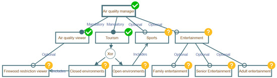 To test our proposal, we performed a test case in the context of an air quality-based activity recommender system, in which, based on a feature model, we generated variation points and their subsequent variability management. Figure 5 presents the feature model for the activity recommender system, which has the following properties; here, the features that are always active in the domain are presented with a check mark, and features that appear with a question mark indicate that they must be configured at the point of variation.