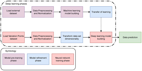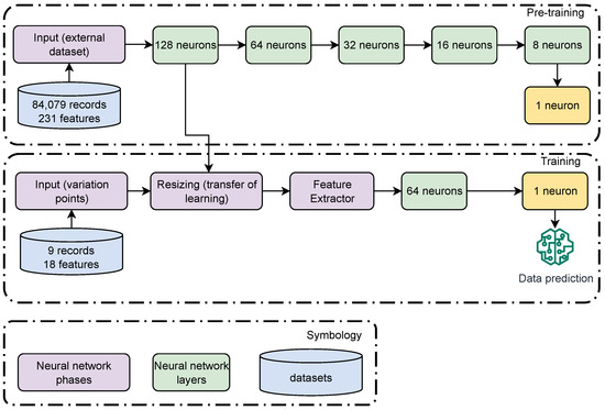 Finally, we build a deep neural network model using the extracted features for the small dataset. The network has several dense layers with different sizes and activation functions to train the model with the training data from the set of variation points. After training the neural network, we perform a regression-type prediction for all the variation points obtained from the permutation of features and their relationships. Figure 7 presents the training phases of deep learning training in the transfer of learning.