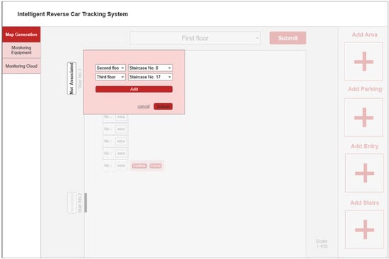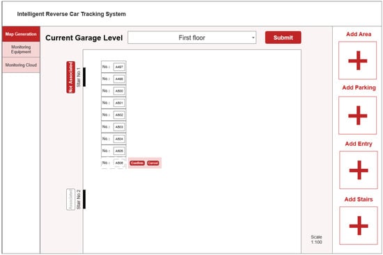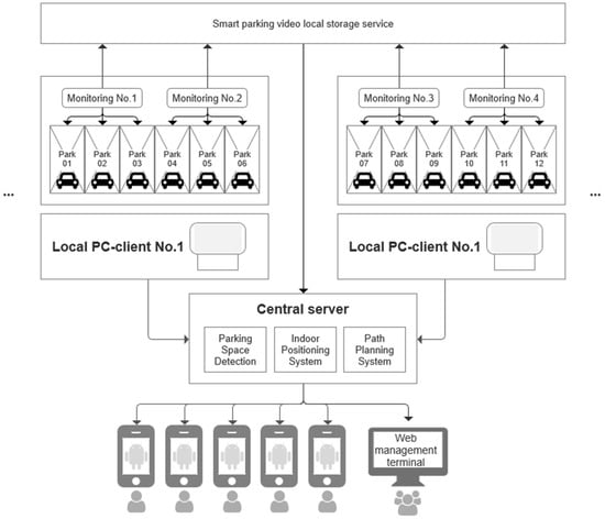 The reverse car searching system was improved based on the existing intelligent parking management system [22]. The image captured by the surveillance camera is stored in the local video storage device of the garage, and the license plate image is uploaded to the central server of the reverse car searching system for recognition.