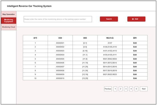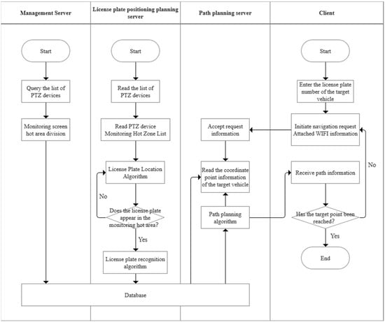 The user terminal processing logic diagram is shown in Figure 2. The PTZ (Pan Tilt Zoom Camera, Model: DS-2DE3Q122MY-T/GLSE, Hikvision, Hangzhou, China) device is used to monitor the parking space in the garages in real-time, and the monitoring video images are uploaded to the local server for storage and reported to the system center server for vehicle data processing.