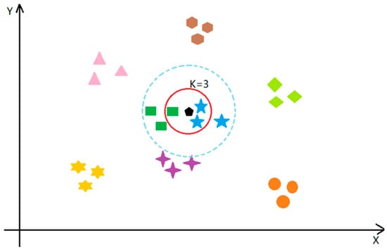 When a new wireless signal strength x appears (x is not in the fingerprint database) during the operation of the car searching system, it is not feasible to match the location of the wireless signal strength x only by relying on the fingerprint database. The KNN proximity algorithm is used to compare x in the fingerprint database with the filter items that meet the conditions, i.e., data in the circle domain within a certain limited range, and then the K adjacent nodes that are closest to x are obtained, as shown in Figure 10. The K adjacent nodes are located by the weighted average method [51].