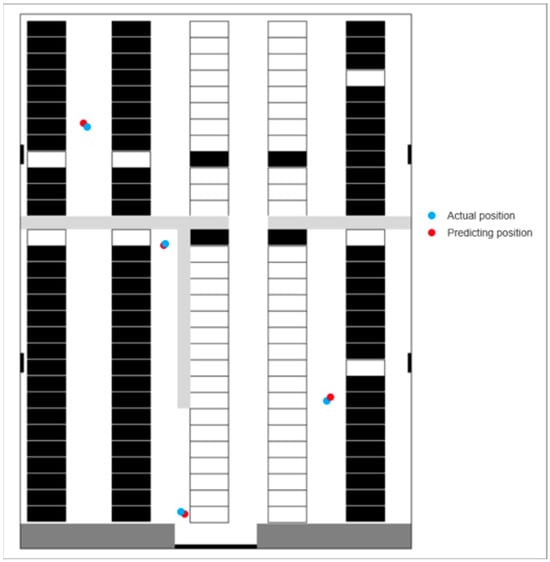 In the study, the plane layout of the three-story example garage is shown in Figure 10. The actual map size is 80 m × 60 m, and the comparison scale is 1:850. There are 150 standard parking spaces of 2.5 m × 5.0 m in the garage, and there are four walking stairways, one driving exit, three sides of interference signal wall, and two elevator shafts. Among them, WIFI through the wall will cause 15% signal attenuation, and around the strong magnetic field will cause about 30% signal attenuation. According to the above conditions, the WIFI signal source location is arranged, and to ensure the relative accuracy of positioning, a WIFI signal transmitter is arranged every 10 m on the map. According to the WIFI signal attenuation formula, RSSI information of WIFI signal strength at every 5 m interval in the garage is calculated, and the calculation formula is shown in Formula (3):